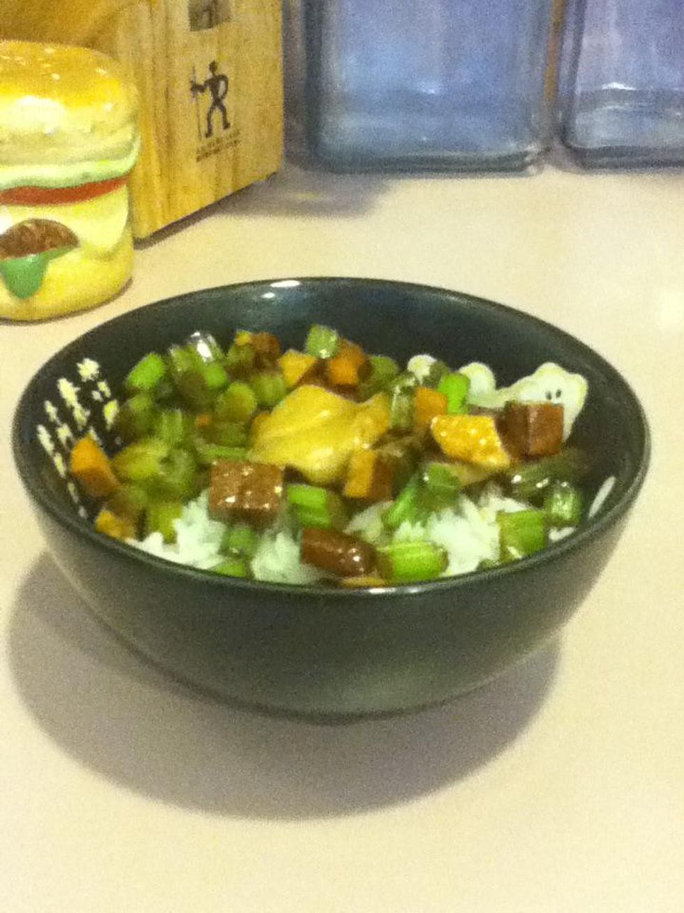The best way to eat this is to serve a few spoonfuls of the celery and tofu over rice with a dollop of the mayo-hoisin sauce on top. Enjoy!