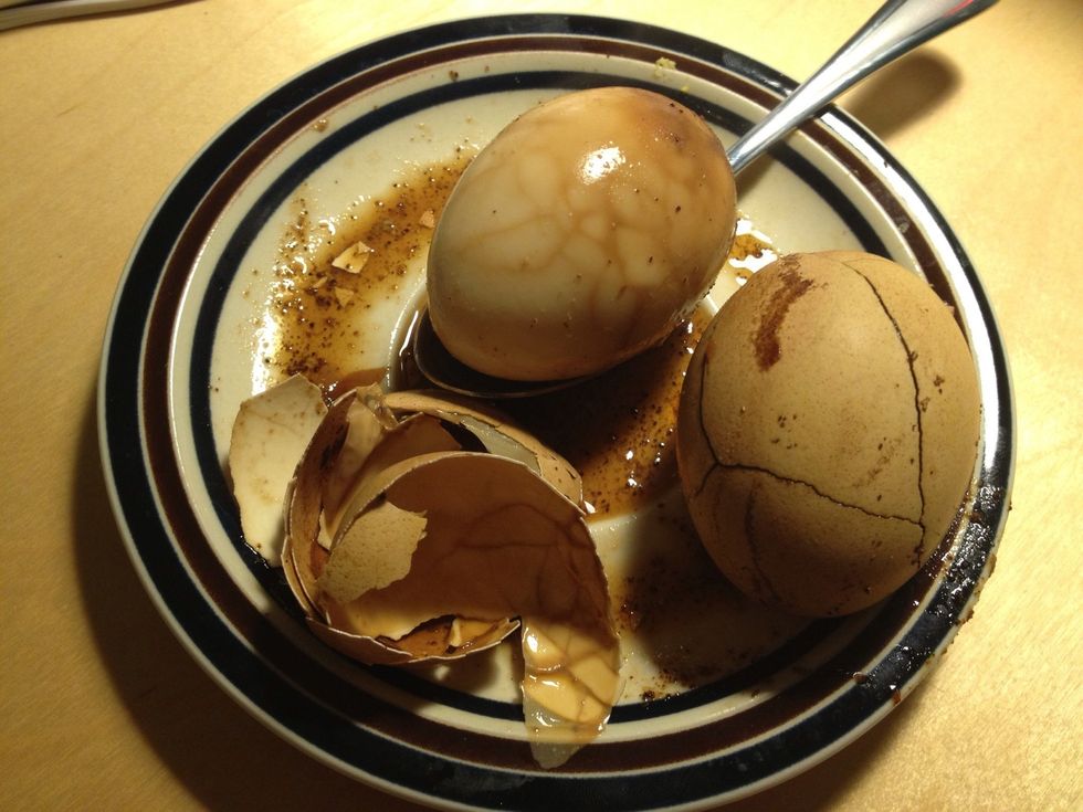 The eggs should be steep for several hours or longer, the dark color of spiced tea a marbled design when it is peeled.