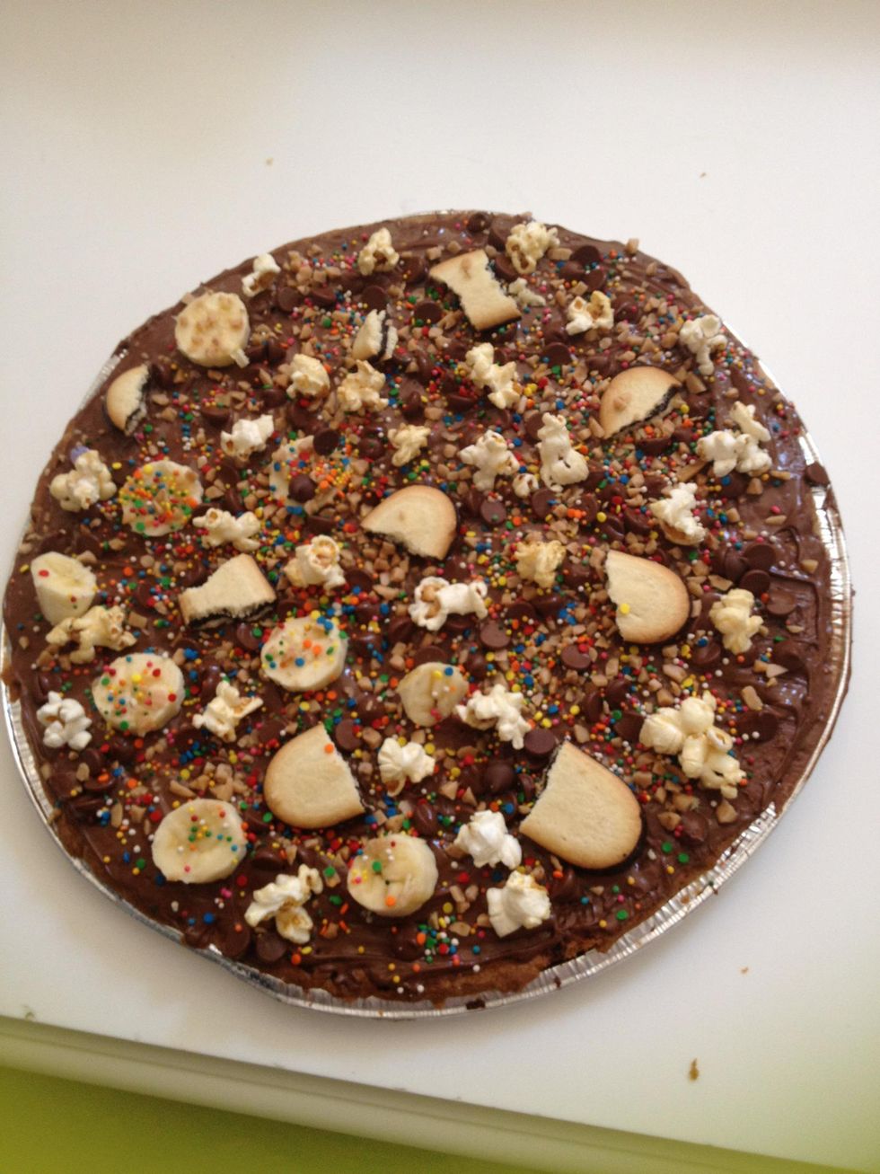 Finish adding toppings! We added kettle corn, bananas, toffee, sprinkles, cookies and chocolate chips! Or us oreos pretzels strawberries or marshmallows!