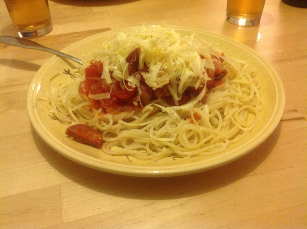 Drain the spaghetti and drizzle a little olive oil over. Mix it around with the fork to stop it from sticking and keep warm.