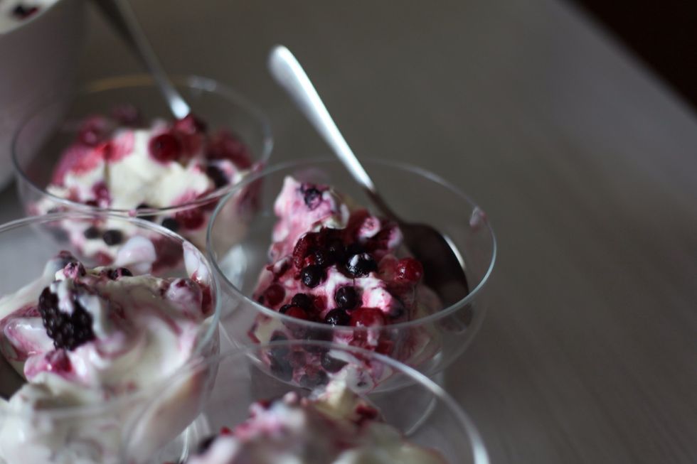 Add just a small handful of berries all around on top of the yoghurt. Now you might want to dig in right now, but please resist. We're not done yet... Almost ;)