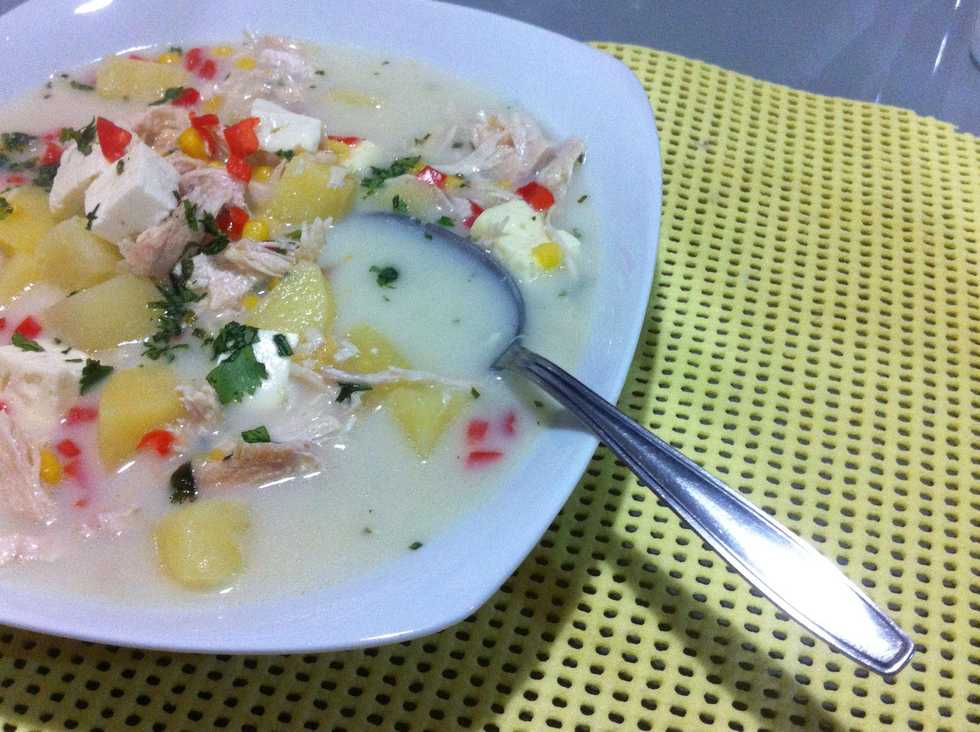 El queso en cubos, el maíz escurrido... El líquido de la lata se agrega al caldo del pollo. Cilantro y ají dulce cortado finamente!