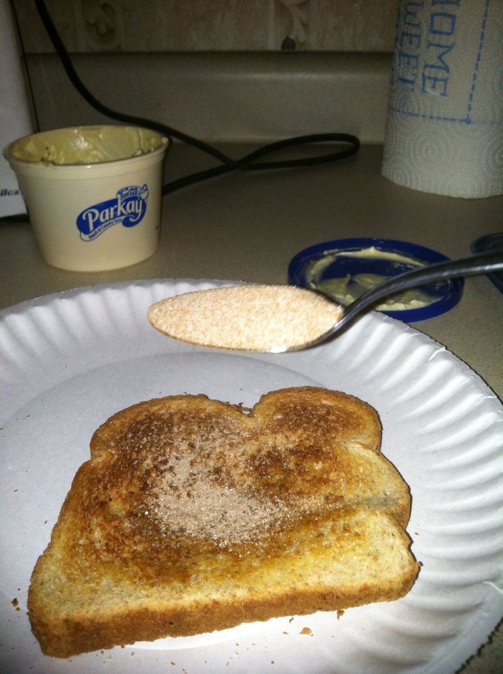 While waiting for it to cook, you can get out your supplies, such as spoon, knife, plate, butter,and cinnamon
