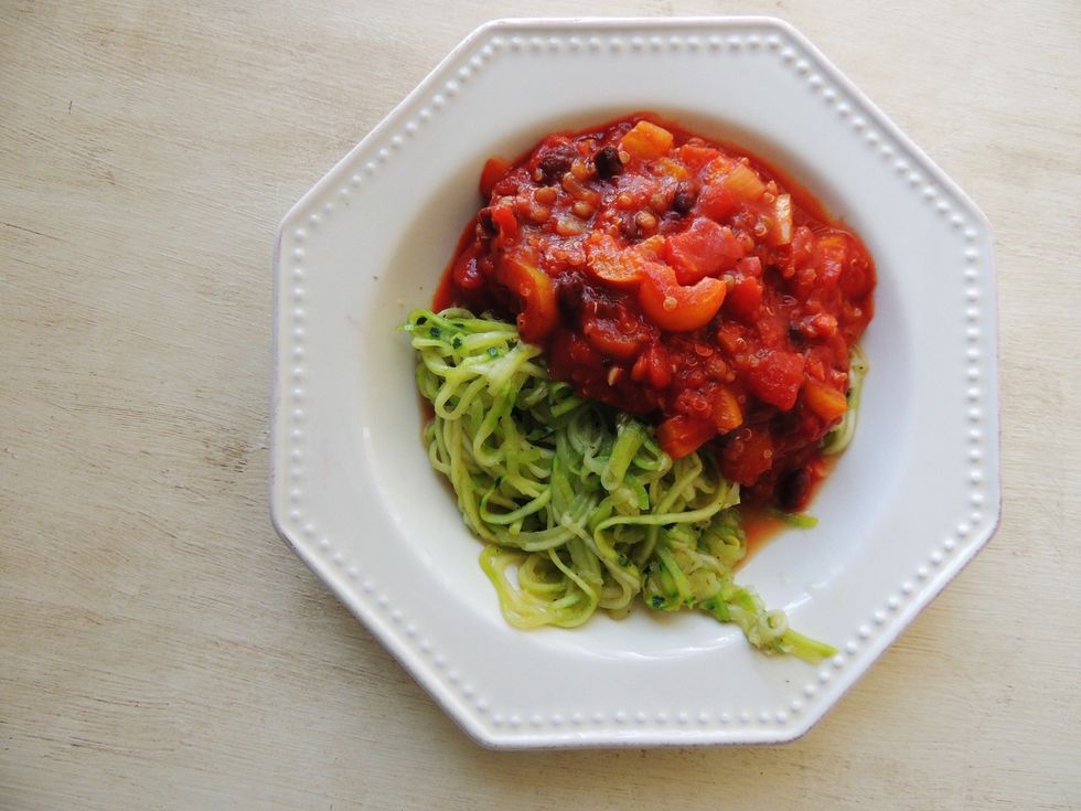 Spiraling the zucchini is easy and fun! Walmart has a gadget for $3 that resembles a pencil sharpener. Tip: when you get close to the end of the zucchini, stick a fork in it and keep going.