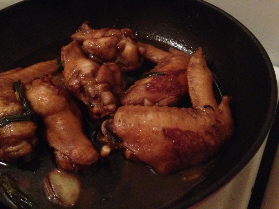 Remove wings and use the same pan to cook ginger, garlic and green onion until you can smell the flavors.