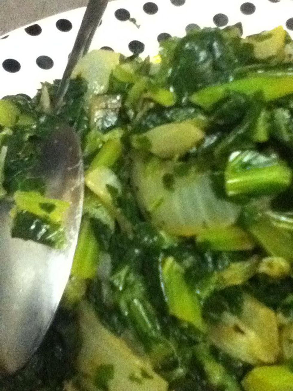 Add the greens and chicken broth and simmer until heated through.