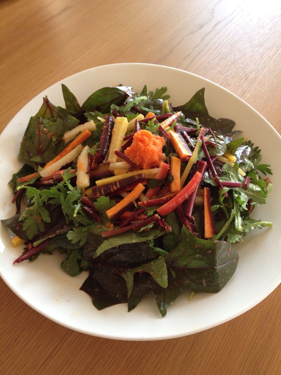 Wash green leaves and wipe water well. Mix vegetables and the dressing in a bowl gently by hands.