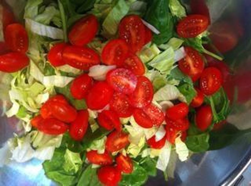 Here are the tomatoes!! Don't have to cut the lettuce though... I usually serve the pasta over a whole lettuce leaf but you can chop it up like so.