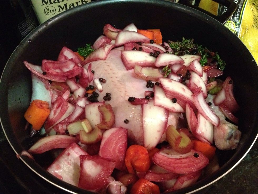 Carefully add the chicken back into the pot. Try not to splash the marinade!