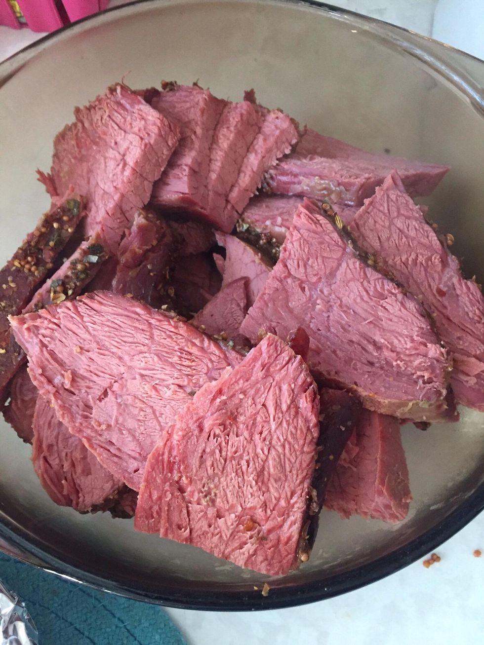 If brisket came with seasoning packet, sprinkle that over top and add any other pepper or mixed seasoning you would like.