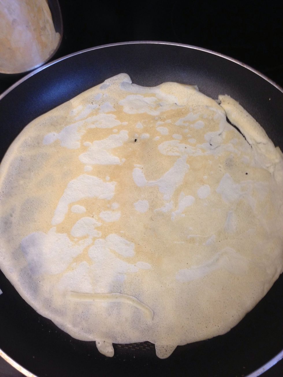 Don't pour to much batter, as you want these thin as possible. Roll the batter around the pan until there are no holes.