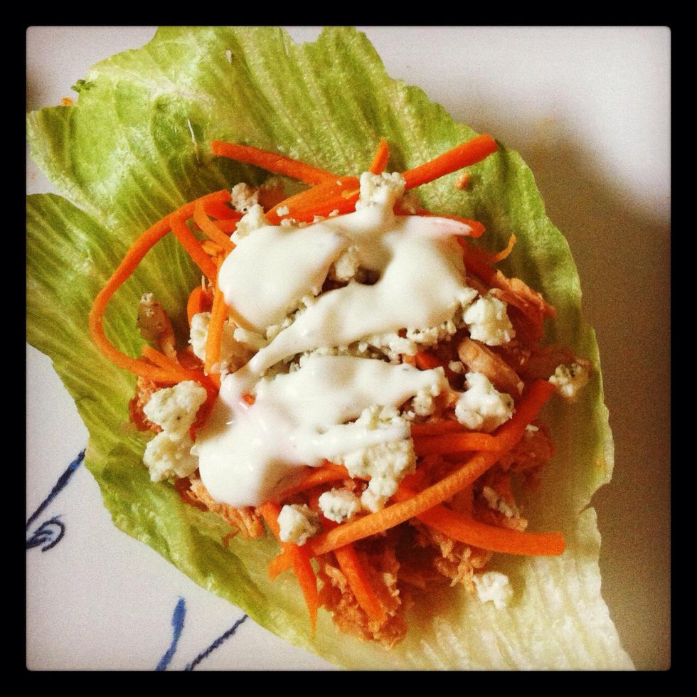 To prepare lettuce cups, place some chicken on each leaf, top with shredded carrots, celery (if using), blue cheese crumbles (if using) and dressing of your choice. Enjoy!!