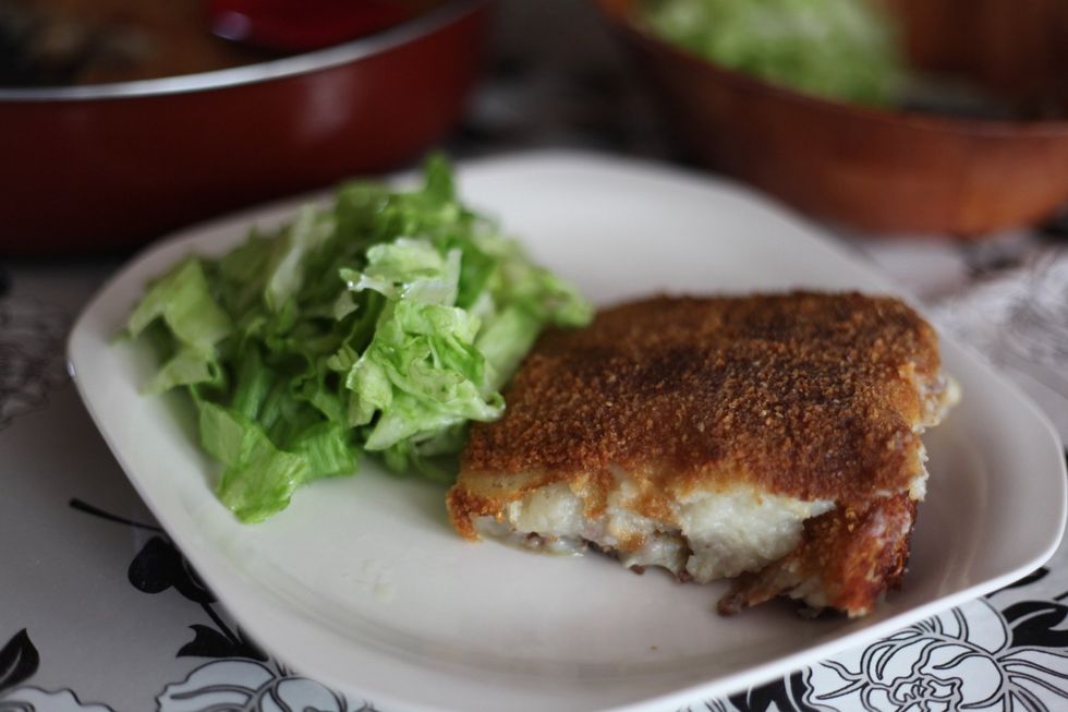 Delicious crunchy outer and soft succulent inner. I'm talking about the potato bake. Lol. Salad: 1 large lettuce, lemon juice, salt, 1 tbsp of white vinegar and olive oil. It's an amazing match. :)