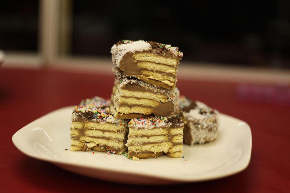 Once you've covered the biscuits with the chocolate custard, start a new layer of biscuit directly on top of the previous layer.