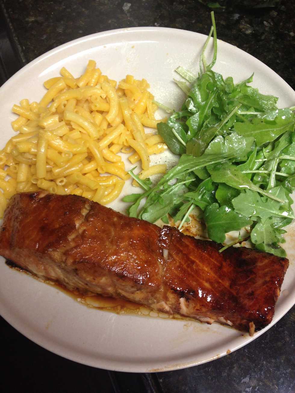 Combine olive oil, soy sauce and garlic and pour over your salmon.Season with black pepper, as much or as little as you like.