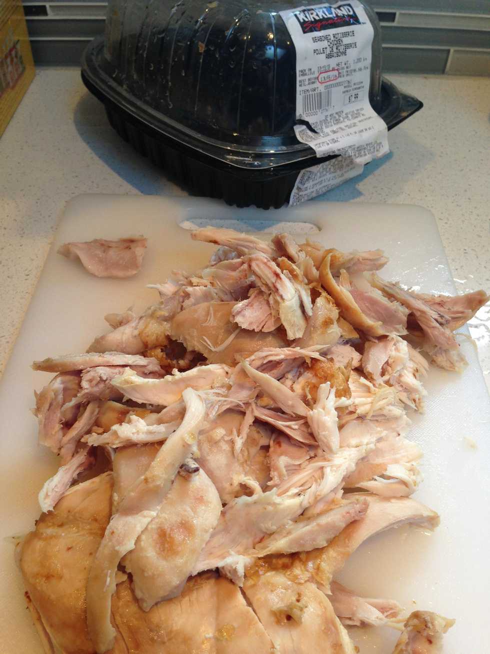 I just buy a rotisserie chicken and take the meat off the bones. I use 1/2 the meat diced for the soup.