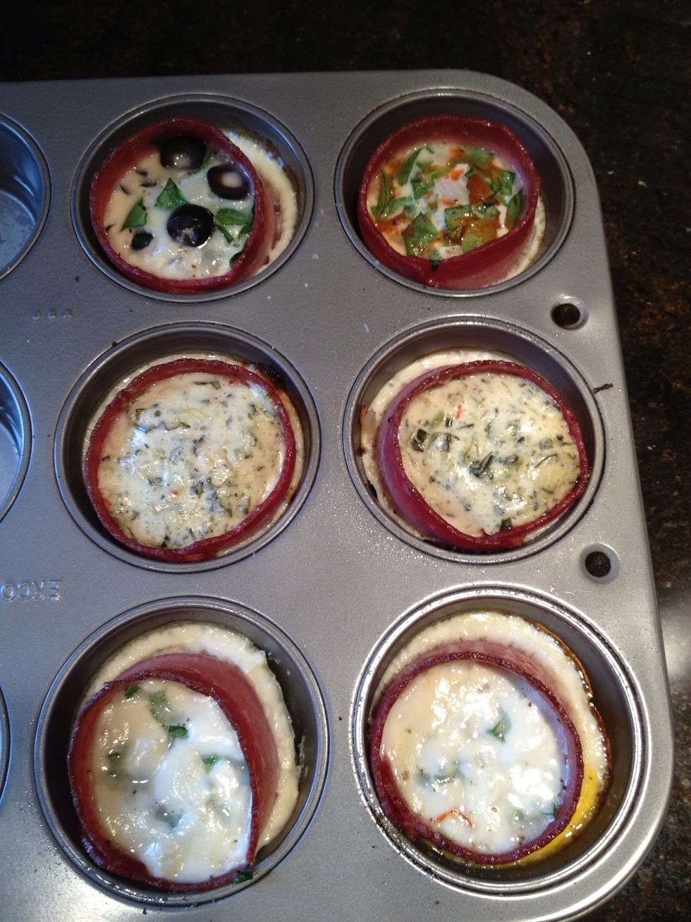 Circle 1 strip bacon per muffin tin, add 1 egg per cup and add onions, spinach, salt, pepper and garlic powder to all 6. I did two with cheese, two with dip, one with hot sauce and one with olives.