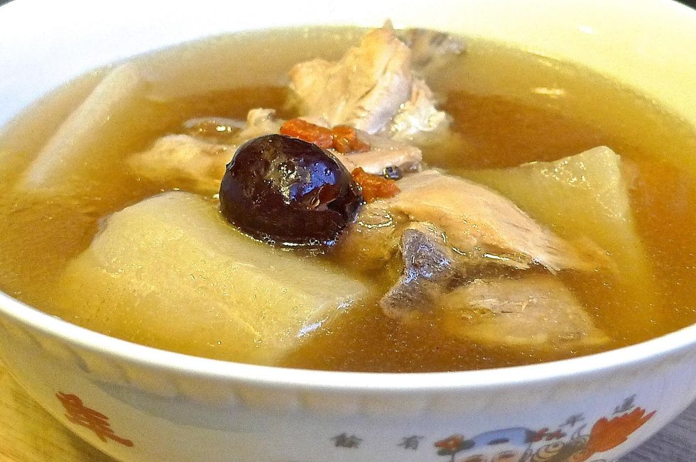 To cook this healthy and detoxifying soup, first cut radish into large chunks, soak red dates to soften soaked kei qi in cold water and wash whole white peppercorns.