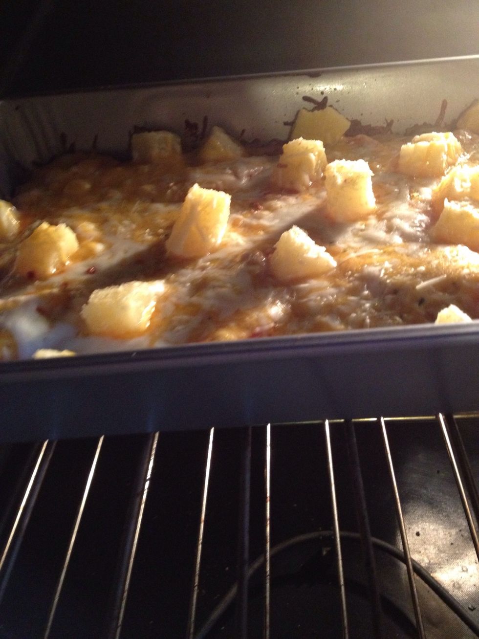 Mix cream cheese eggs and cheese until mixed and liquidy Poor into pan and bake x 19 minutes