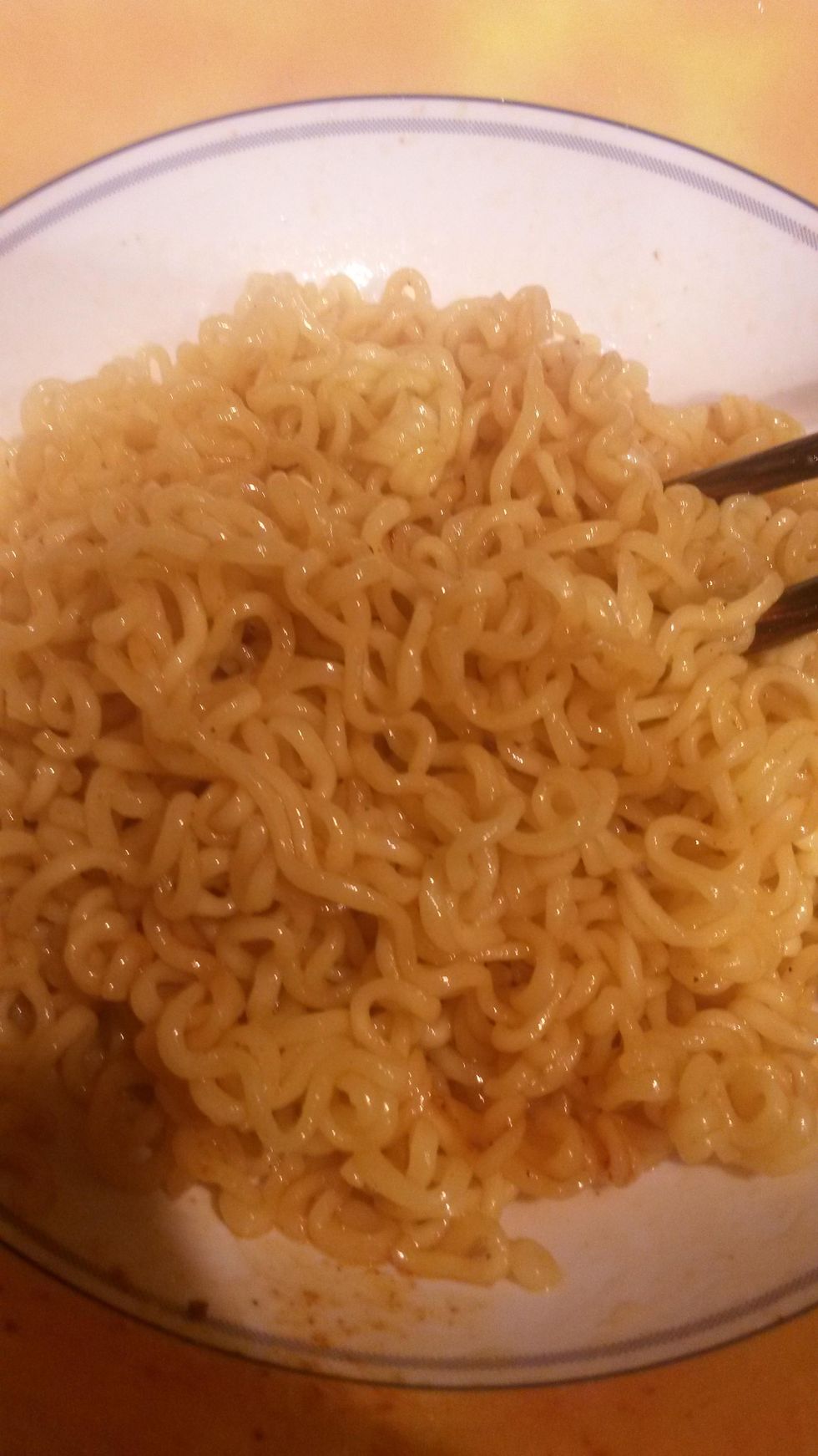Pour the water with ramen into the filtering ladle, preserving only the ramen. Make sure to filter the all of the water out.
