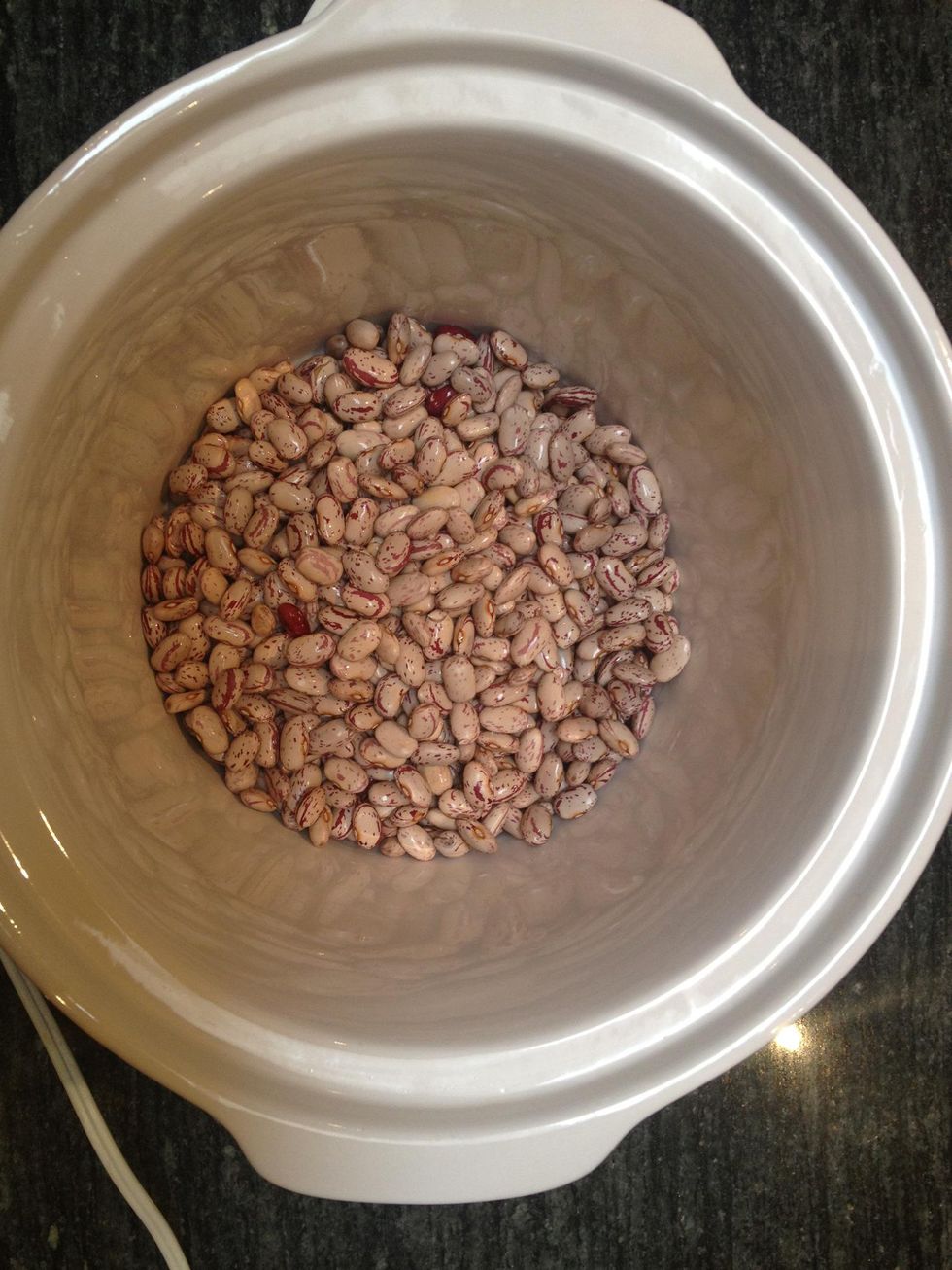 Put in the slow cooker, and cover with 3 inches of water. At this point, you can let them soak overnight, or you can cook them right away. They will take longer to cook without soaking.