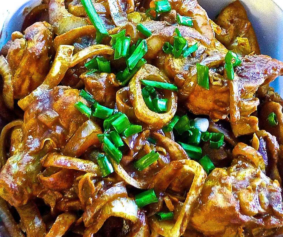 Dish up the dry curry chicken into a serving dish and garnish with more chopped onions before serving. Serve immediately with steamed hot rice.