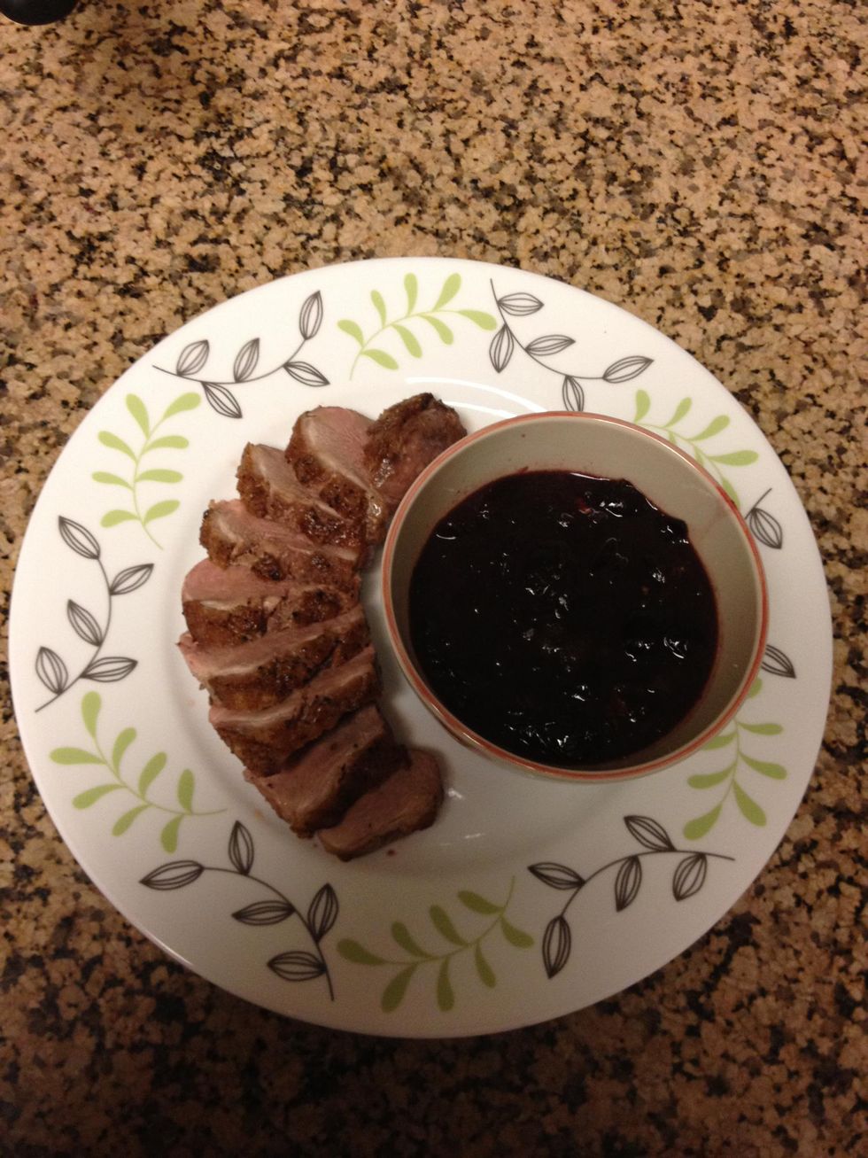 Lastly, add the black cherries. Bring to a boil. Simmer for about 5 minutes to reduce and thicken the sauce. Mash the cherries with a spoon to extract flavor as they cook.