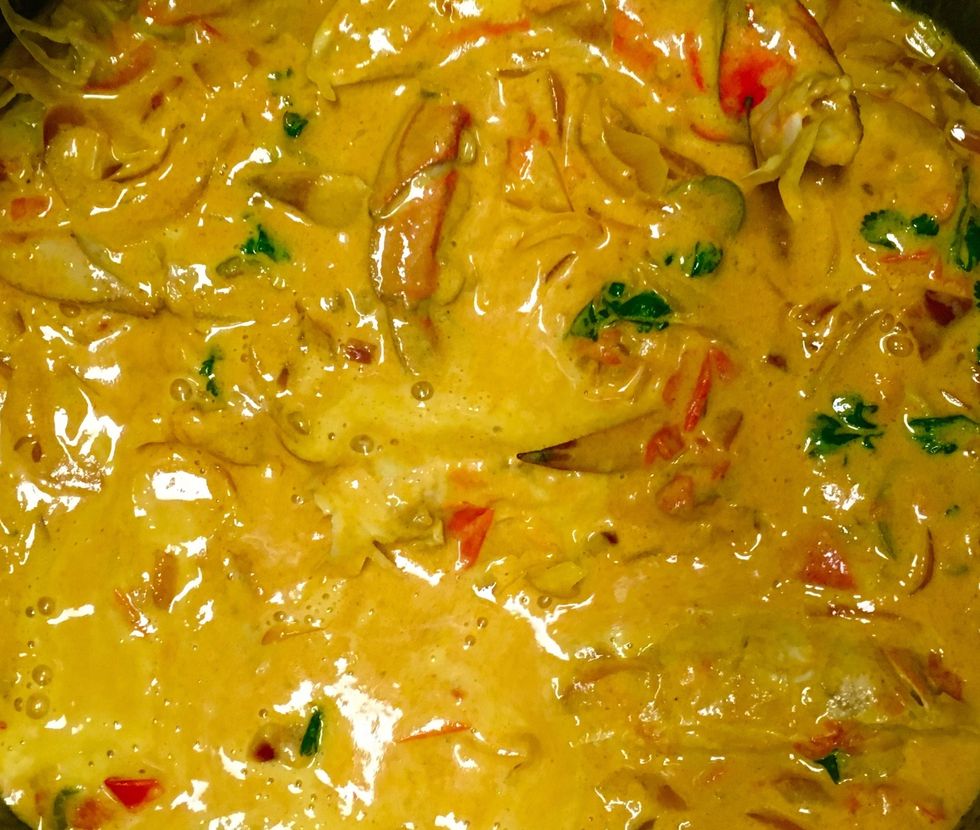 Add coconut milk and salt. Give the mixture a gentle boil and add crabs. Allow to cook for about 5 minutes (as the crabs are pre-cooked). Stir gently. Serve with steaming hot rice.