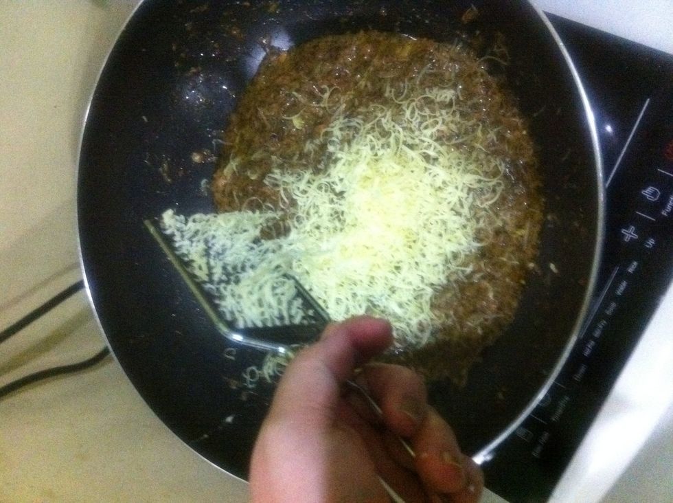 Grate the quick melt cheese over the top of the saute sauce, for about 1 cup and on the stove and cook for about 3 to 5 mins. Stir and quickly remove in the pan.:)