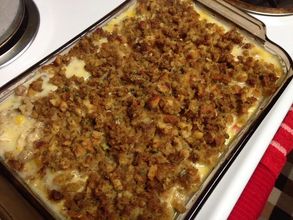 Go ahead & prepare stuffing mix as directed on the package. Thaw frozen veges. Preheat oven to 400 degrees.