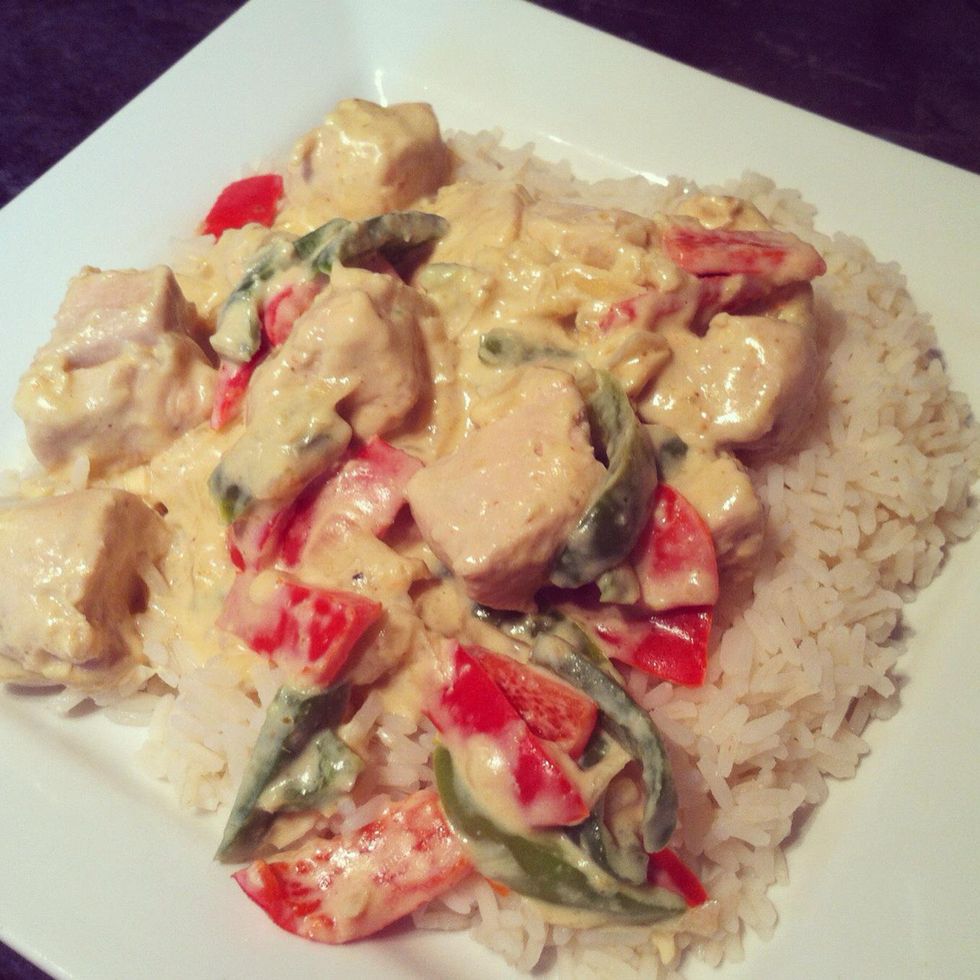 Add chicken and green Thai curry paste to pan and fry for 5-6 mins until cooked through.