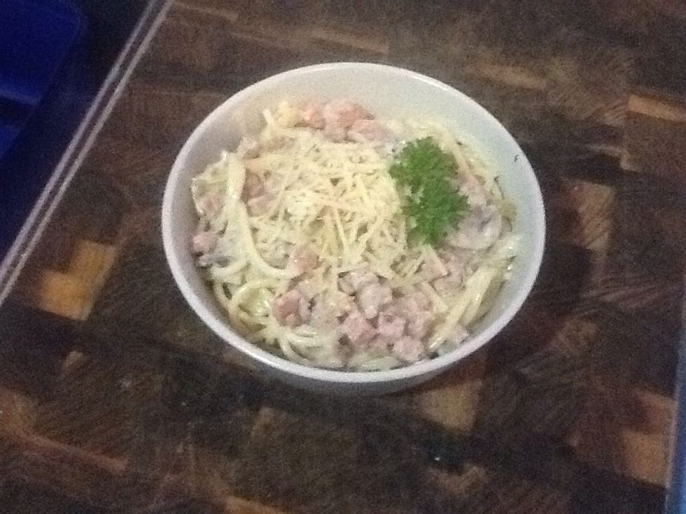 Once spaghetti is drained and the sauce is cooked, stir them both together and serve. Garnish with Parmesan cheese and parsley spig