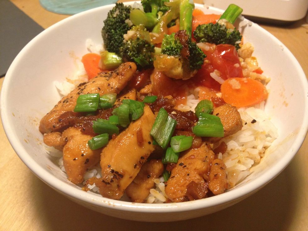 Serve the chicken on top of rice, add some sauce and sprinkle with scallion, as well side veggies.