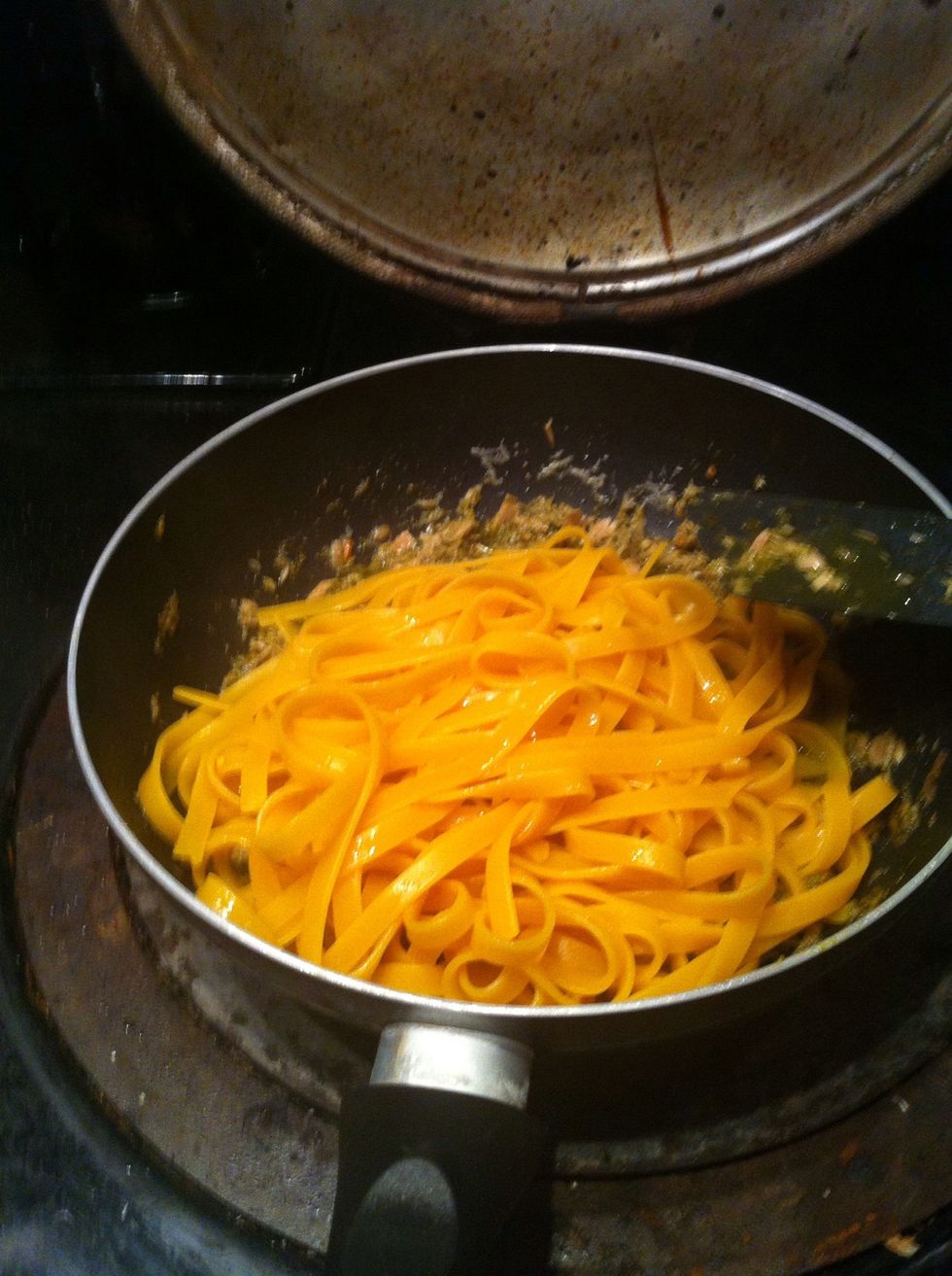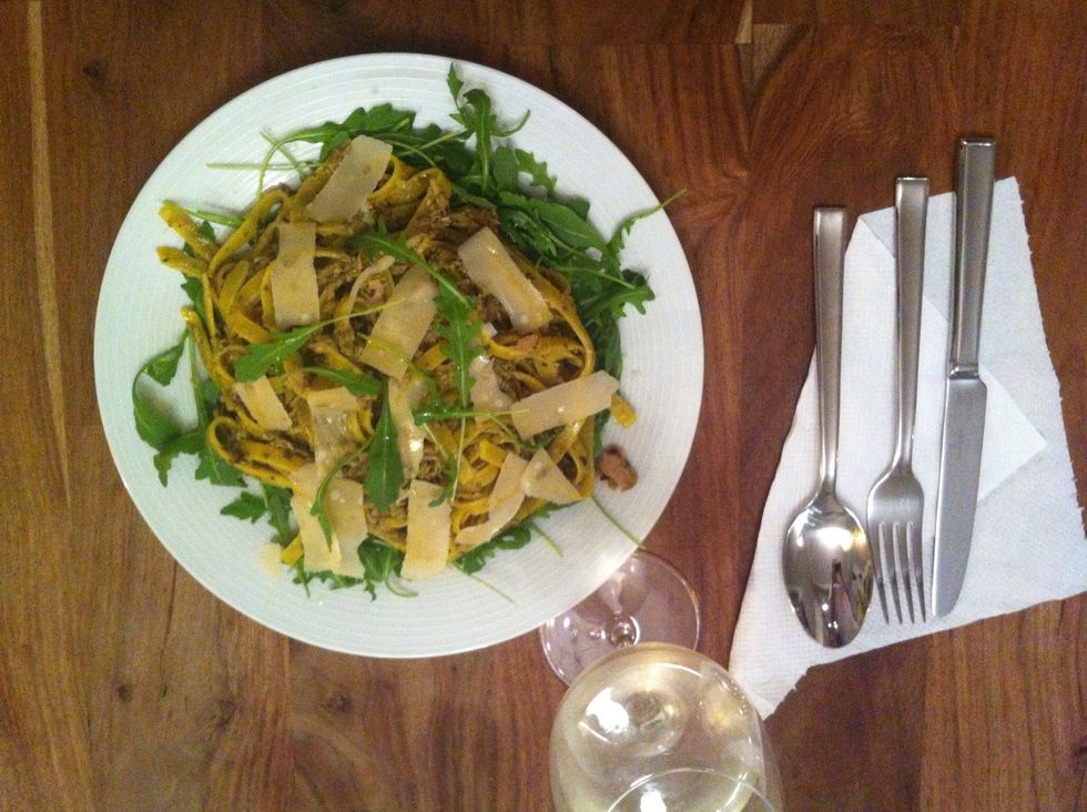 That's all u need :) rocket salad tagliatelle pasta, tuna ( in water or oil ur choice ), chilli flakes, pesto, black pepper, turmeric, garlic, olive oil,parmegiano regiano,