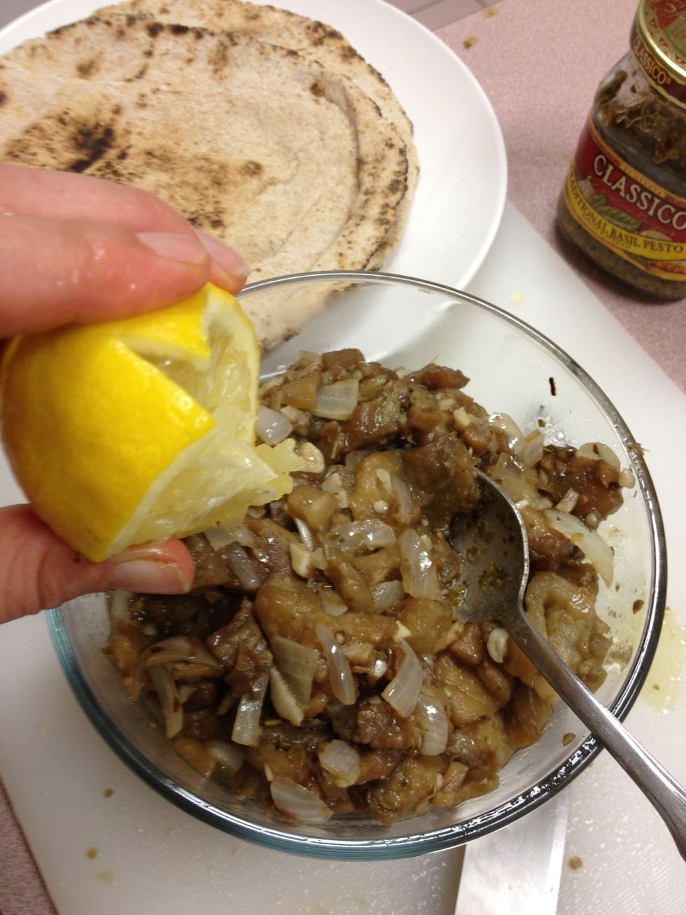 Combine eggplant, pesto, evoo, vinegar to taste, and sautéed mixture