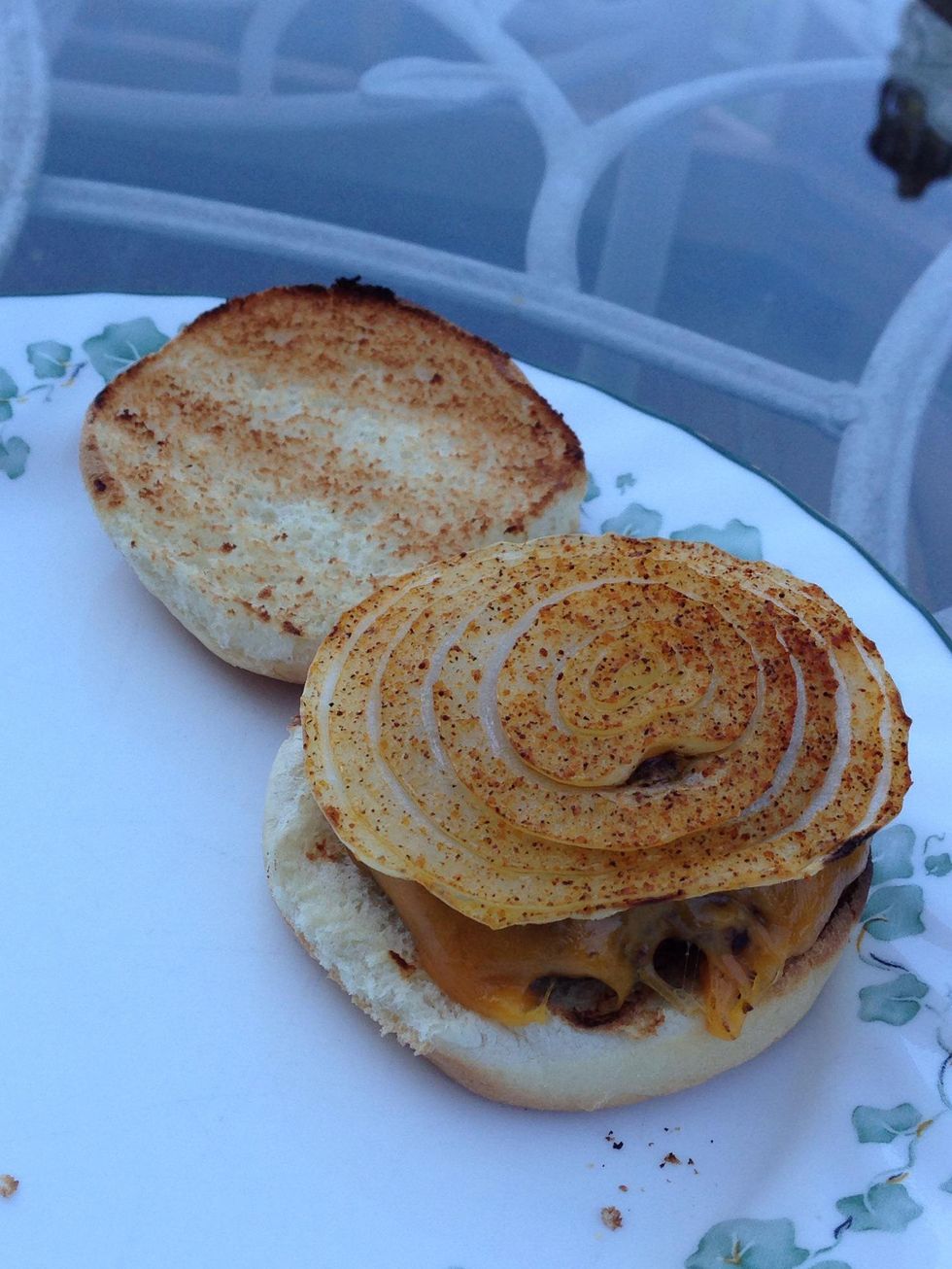 Put the burgers on the grill and the onions on the veg grate. The onions only cook on 1 side. Do not flip them. They may get a little black on the bottom, but that's OK. They'll still taste great.