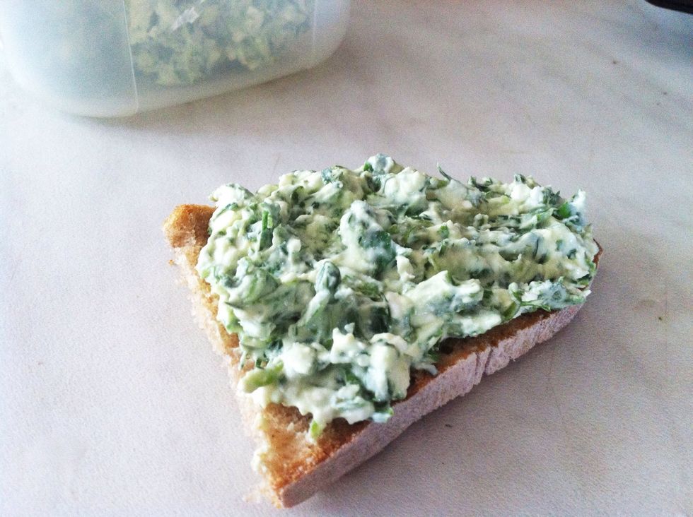 Here you can see a slice of bread with Fera cheese and Herbs! It is really tasty! Just try!
