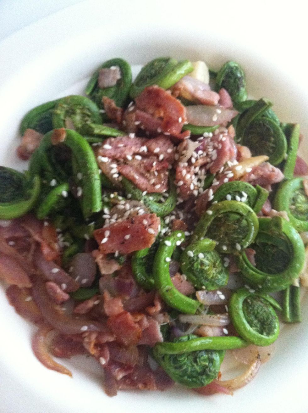 Add the drained fiddleheads into the pan and sautéed for another 5-7 mins with the bacon and onion. I didn't add any salt because the bacon had enough salt already.