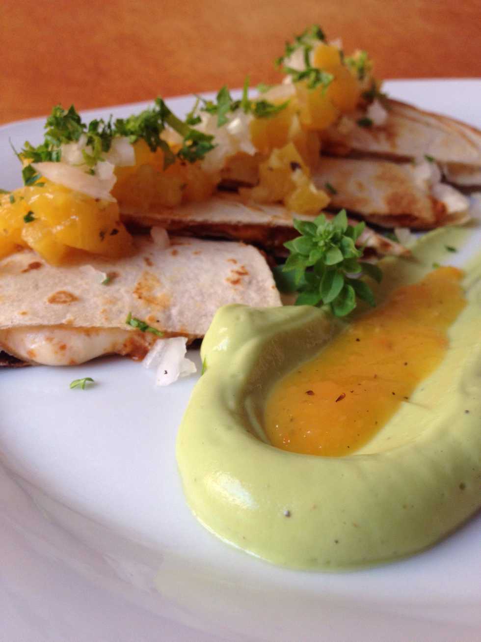 Once it's ready cut it in 4 pieces, plated and on top put the cured pine apple and onion and cilantro, make a guacamole and decorate the plate the way you like it, make it looks tasty, 👌