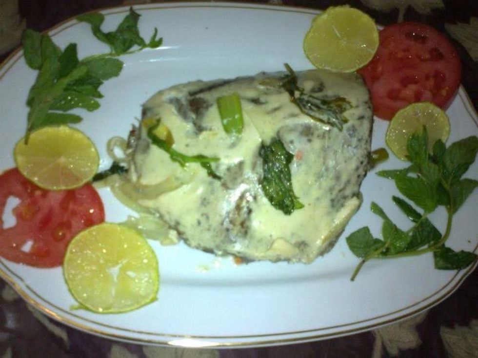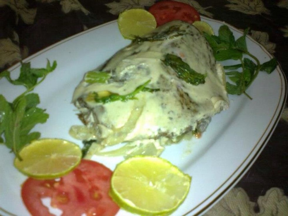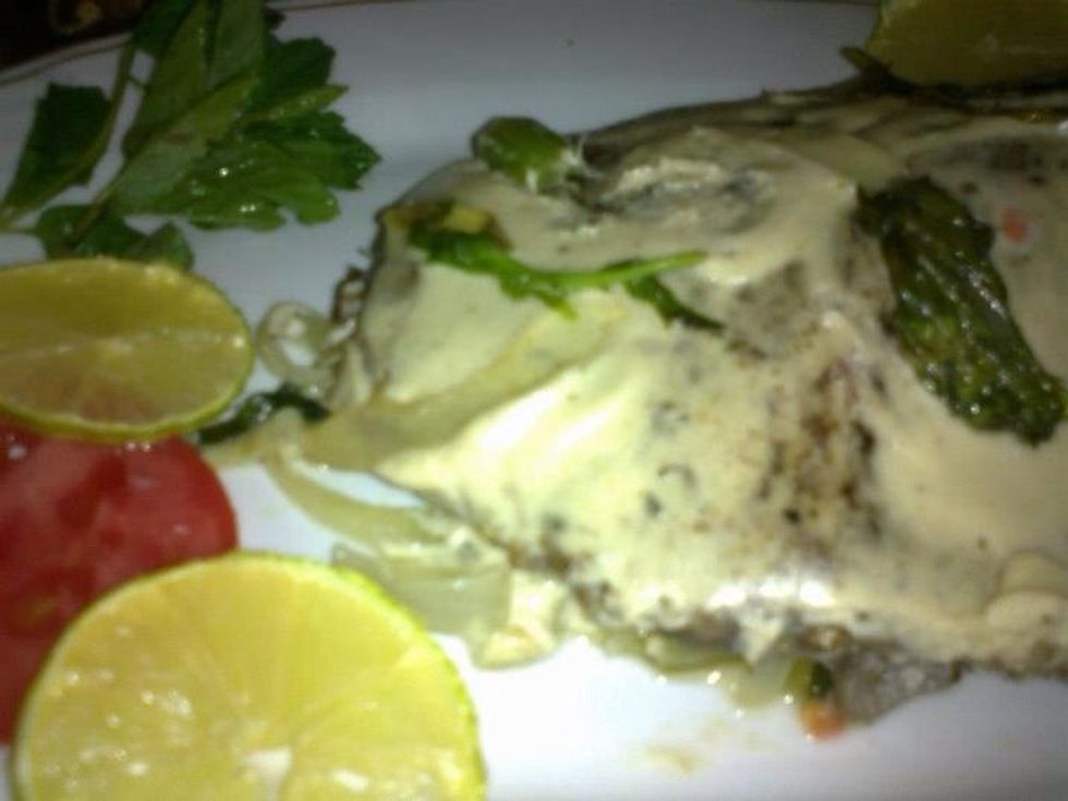 Pour on the fish the tahini which dissolved in it a little of water and lemon juice then put it into the oven for five minutes