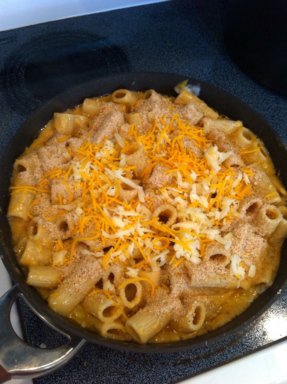 Sprinkle the top of the mixture with remaining cheese and breadcrumbs. Bake for 30-35 minutes or until top is golden brown and bubbly. Serve immediately. Enjoy!! :)