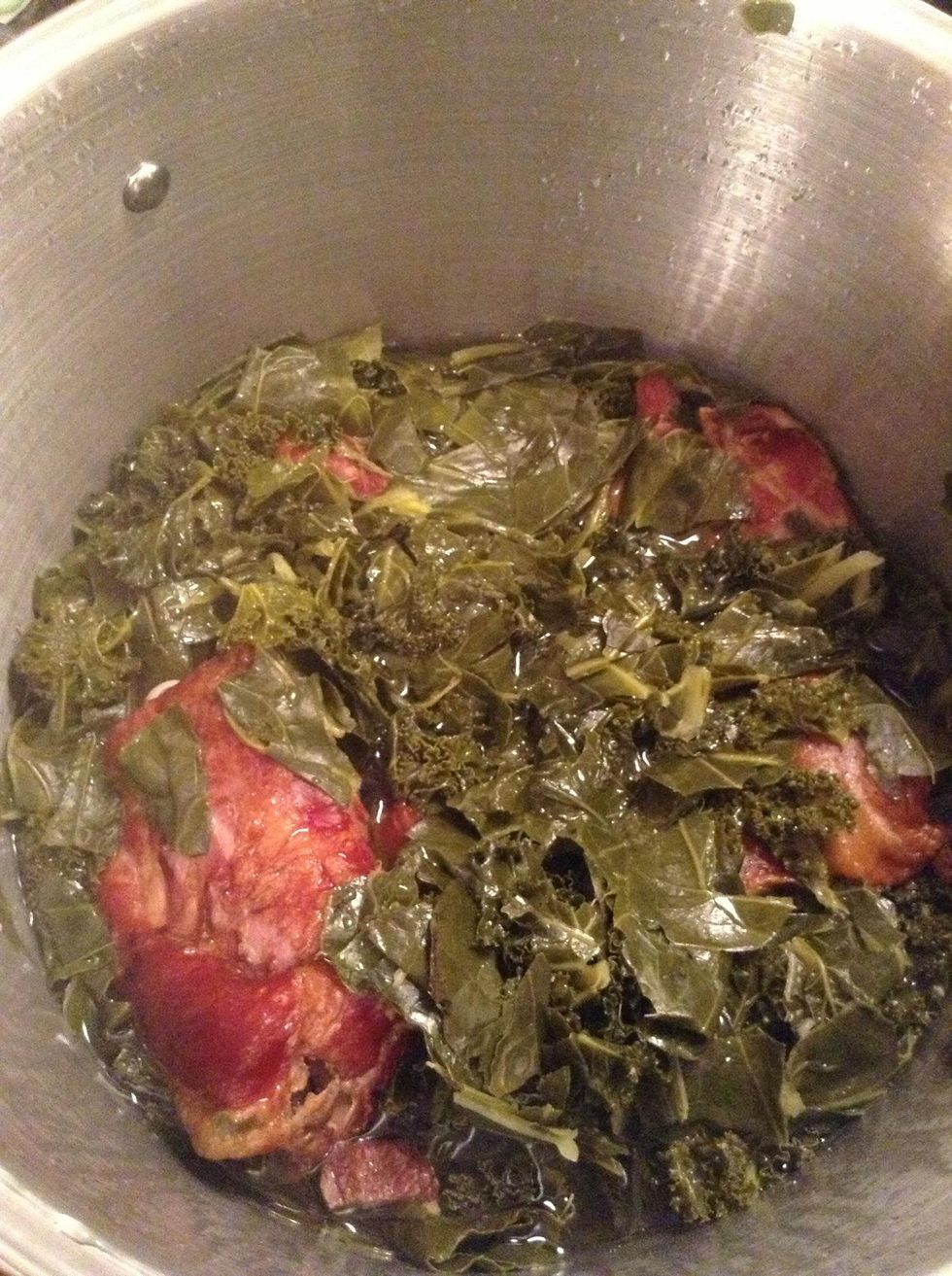 Any greens will work for this tasty "soul food" dish. Here I used collards and kale. You can do collard and kale alone if you want. Turnip & mustard must be mixed with a collard as they are spicy