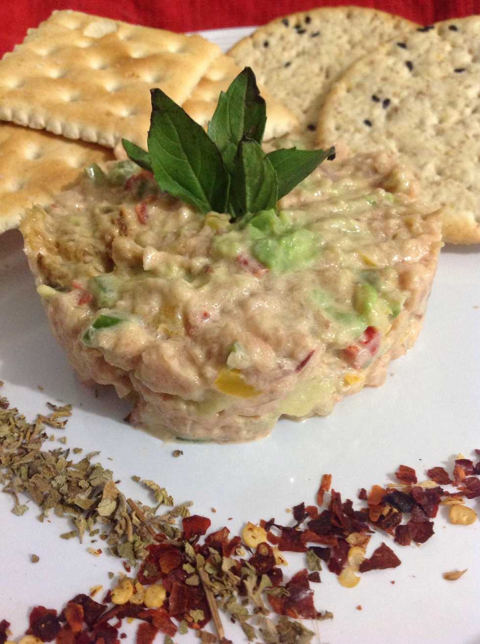 Cut the peppers, avocados and the tuna in small dicesMix everything with chipotle mayo, check flavor, add togarashi and salt & pepperPlate it with crackers, enjoy it!!!! 😘