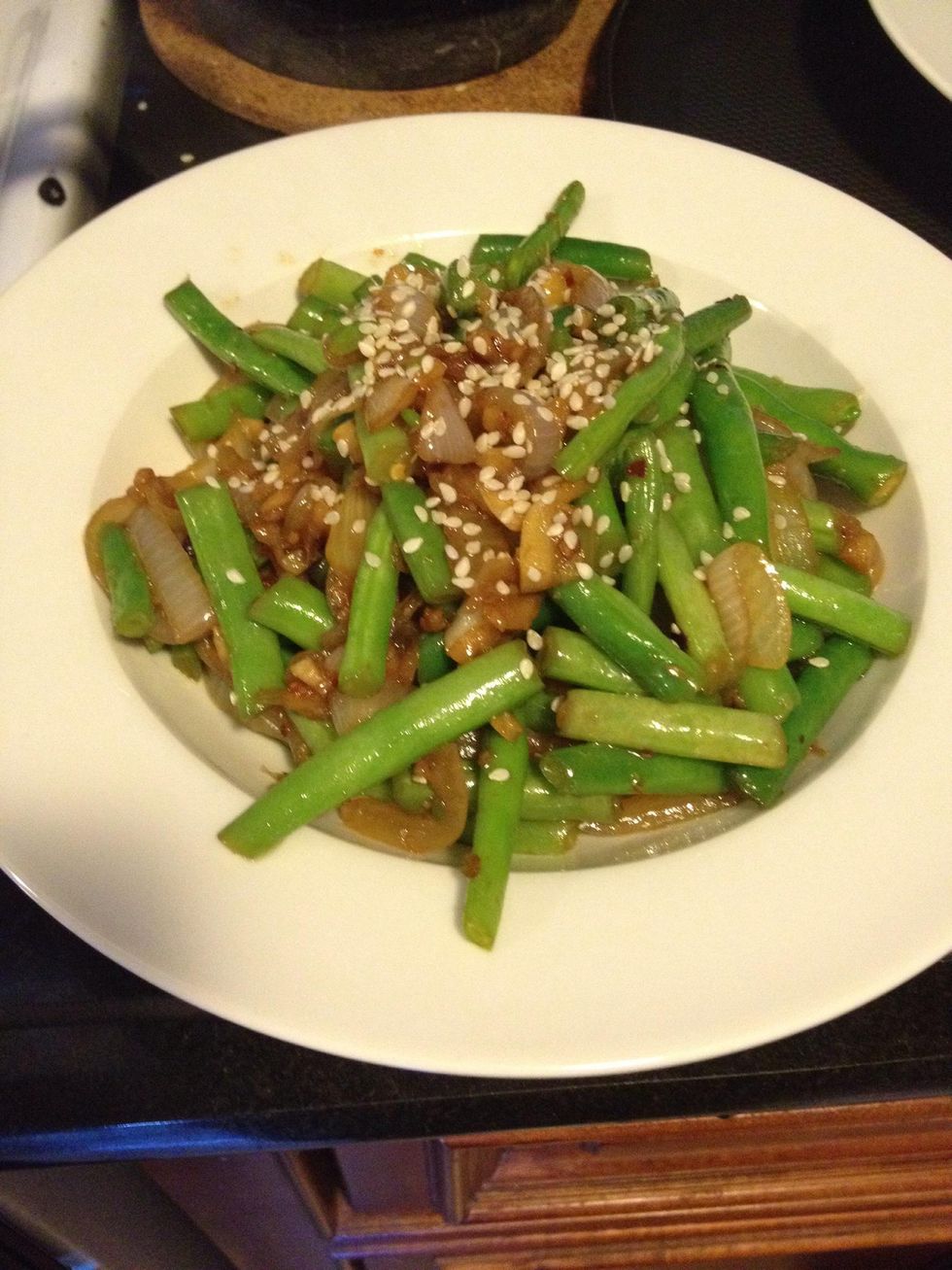Add drained green beans and continue cooking another 2 minutes. To finish, add soy sauce and sesame oil and mix well, then remove skillet from the heat.
