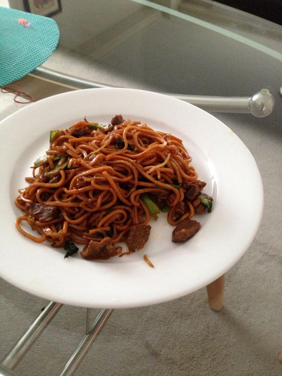 Put oil and garlic on the pan. Fried noodle on the pan followed by the meat and veggies. Add some sweet sauce, oyster sauce, salt, pepper and msg