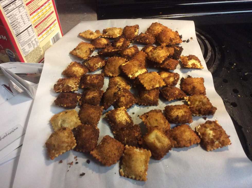 Get 2 bowls for bread crumbs and buttermilk. And pan with parchment paper, so you can put your ravioli on it.