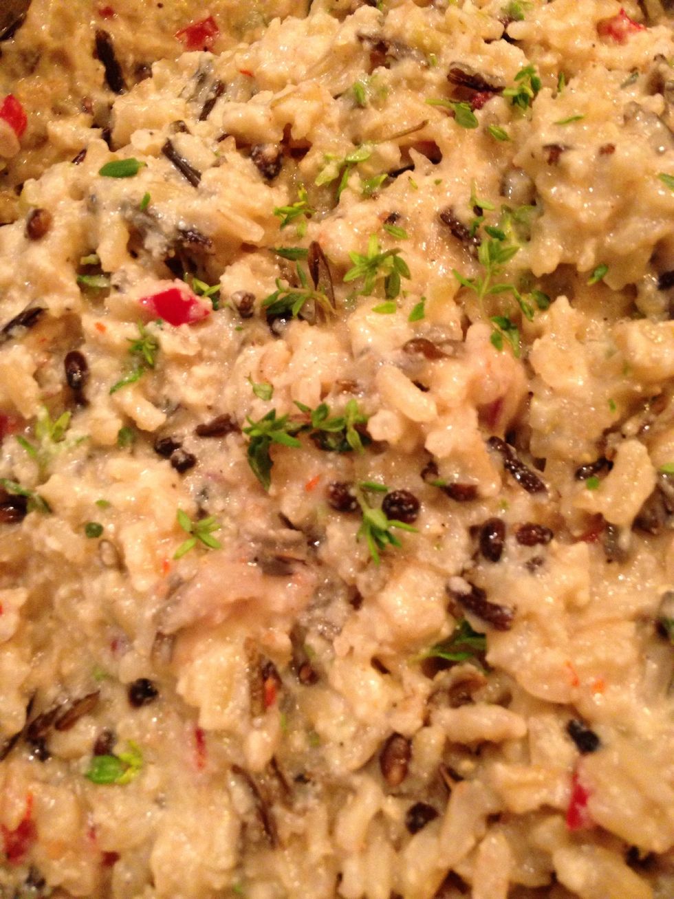 In the hot pot you used to make the rice, dump in the garlic sauce with the fresh thyme & peppers. *Spoon some of this to the side for a little chip marriage when the game comes on later.* 🐻BEARS🐻