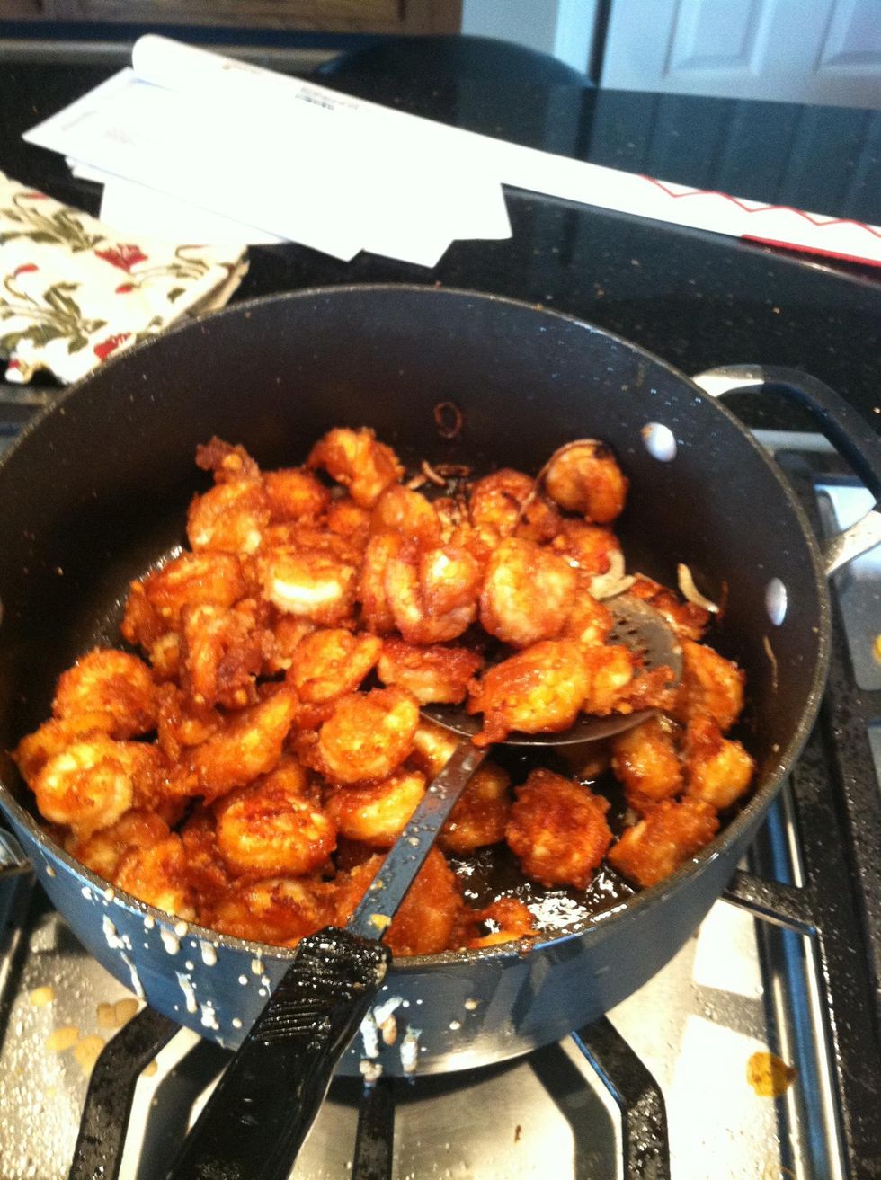 Add shrimp and stir with onions. Let cook for 2-3 minutes and serve.