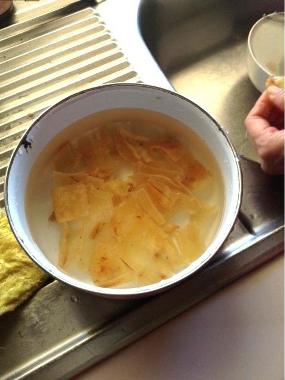 Cut the fish lung into pieces and remove blood clot or stains by cutting it out.