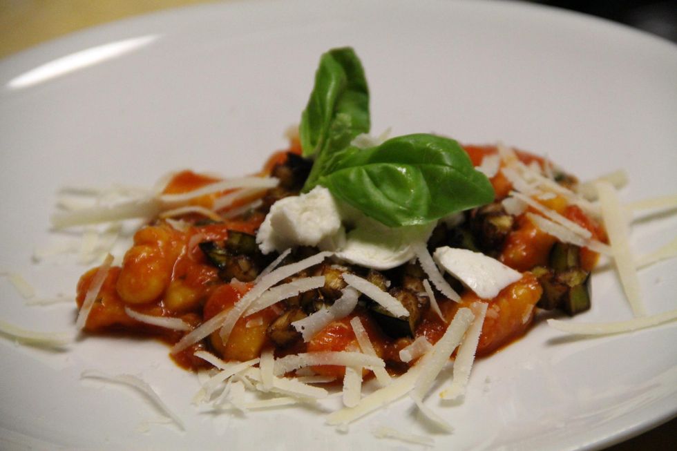 Garnish with pieces of eggplant and mozzarella...grated parmesan and a leaf of basil...enjoy and buon appetito